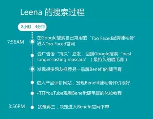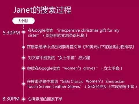 47岁的Janet来自于威斯康辛州,圣诞节快到了,她要为妹妹挑选礼物。于是在下班的路上她用手机开始在Google上搜索,以下是Janet的购物旅程: