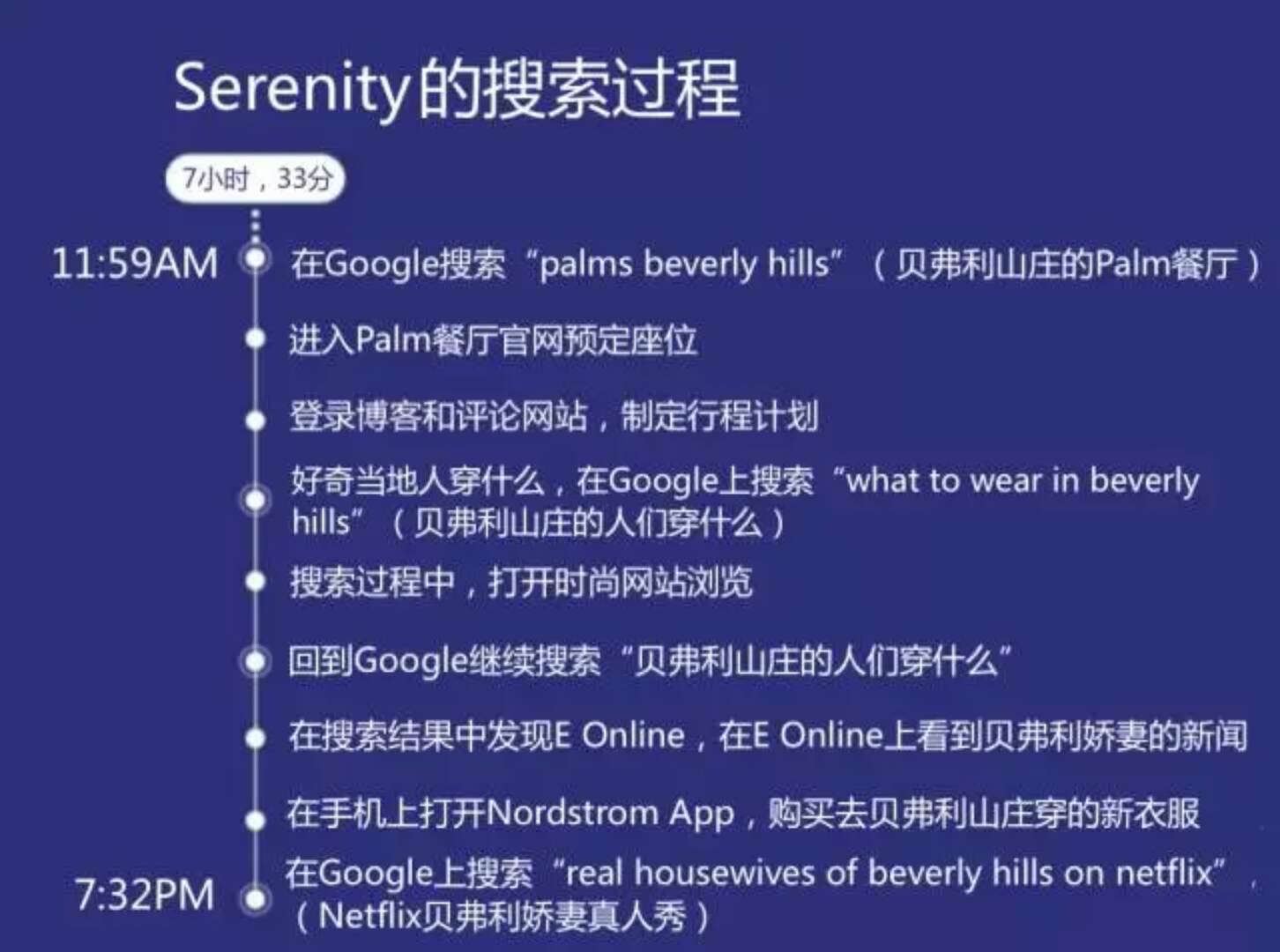 一个简单的旅行可以引起一连串发散搜索——餐厅、博客及评论网站、穿着建议、APP、娱乐新闻、真人秀节目。
