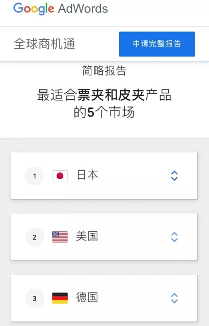 同时,你还要看看和你品类有些关系的其他品类,比如服装-服装配饰-票夹和皮夹的排名,如果这些相关细分品类在全球商机通里也排名靠前,那么说明这些国家真的很合适成为你的目标市场。 票价和皮夹类市场排名是:日本、美国、德国、英国。